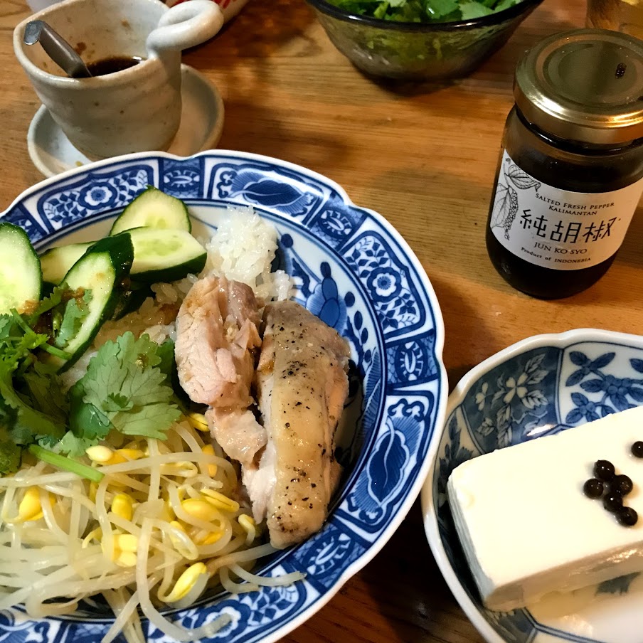 茹でもやし、きゅうり、パクチーとたれを添えて、海南チキンライス風。