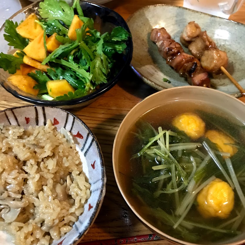 柿と春菊のサラダ、冷凍やきとり。