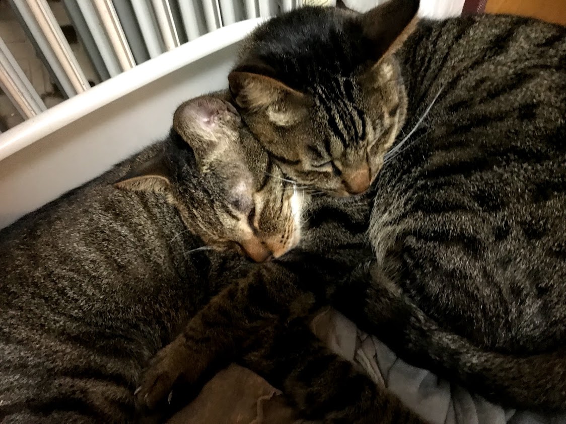 まだ寒い日もあり、ヒーターの前にしましまコンビ。