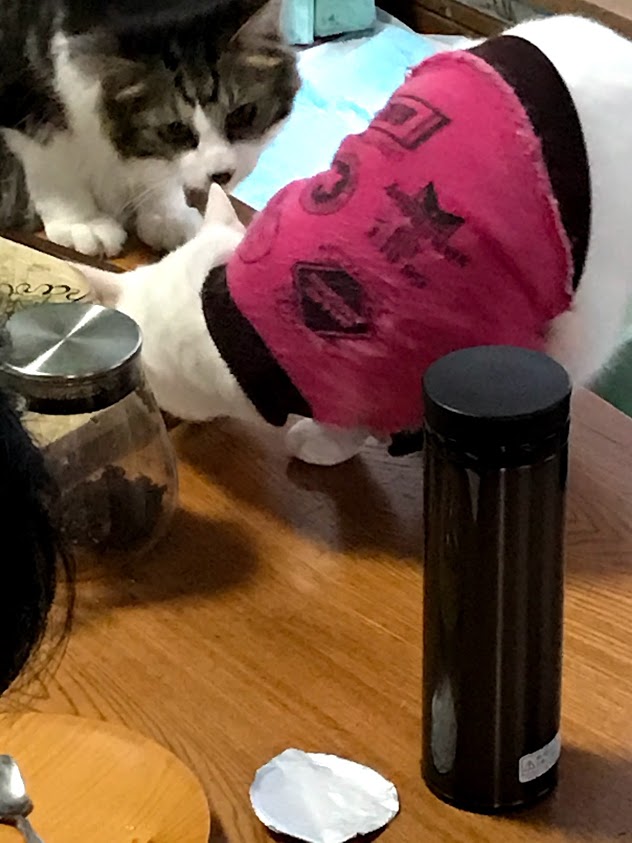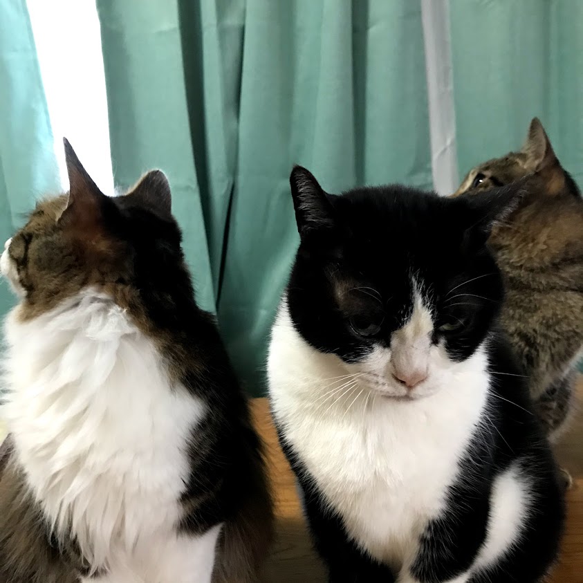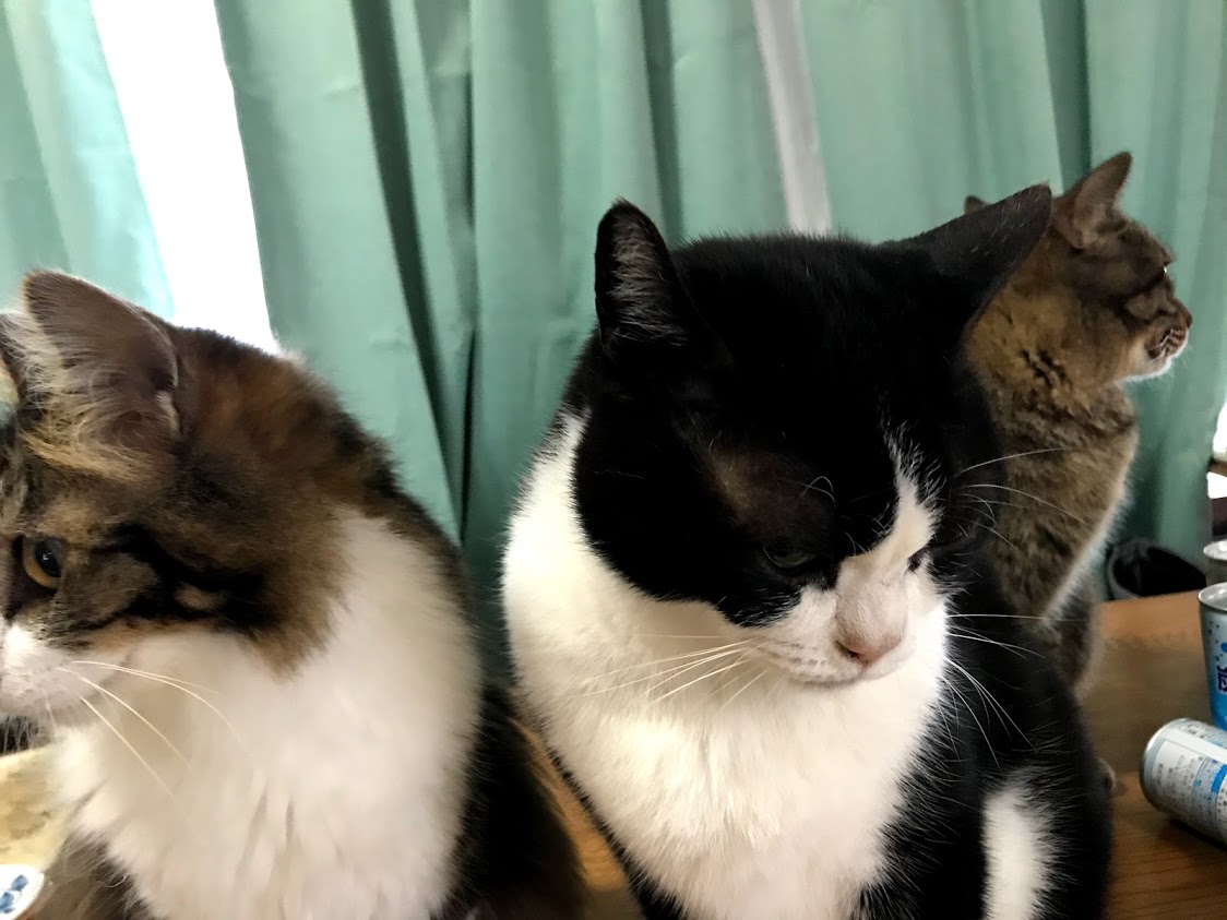 朝、テーブルに猫が並んでいる。