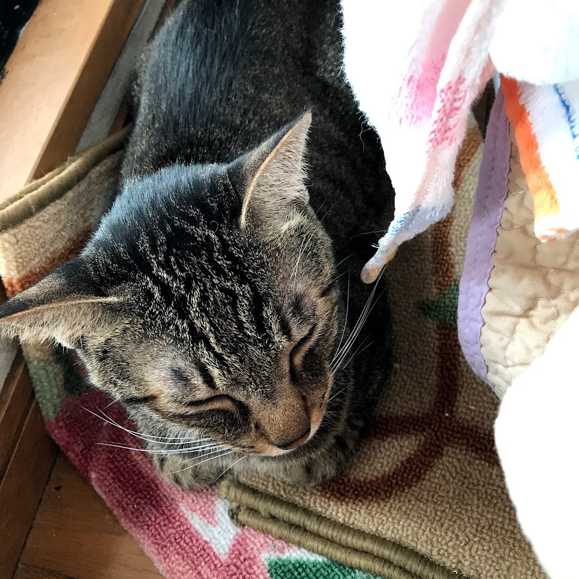 洗濯物の山のかげが、秘密の隠れ家みたいでお気に入りのかんた。