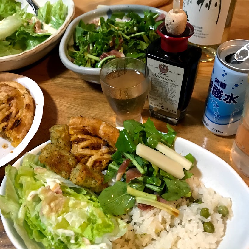 ルッコラと生ハムにはオリーブオイルとバルサミコ。